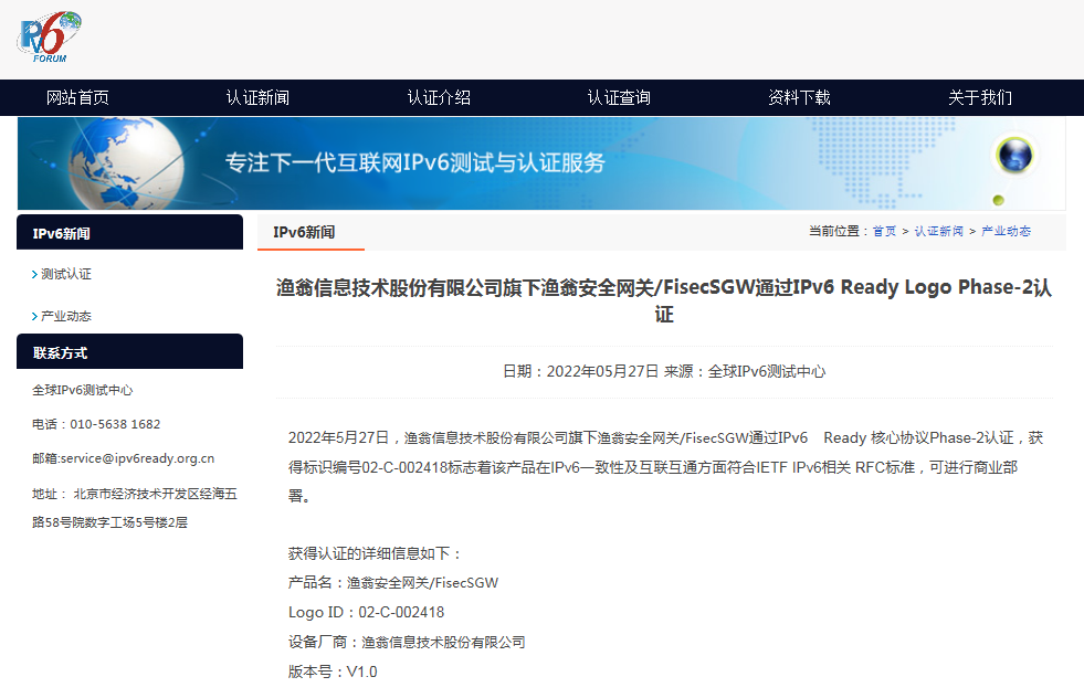 近期,顺发配资安全网关 FisecSGW在下一代互联网国家工程中心-全球IPv6测试中心正式顺利获得IPv6 Ready核心协议Phase-2测试,并荣获由国际组织IPv6 Forum颁发的IPv6 Ready Logo Phase-2认证证书(Logo ID:02-C-002418)。